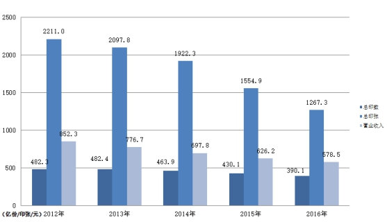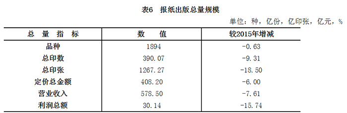 2016年,全国共出版报纸1894种,较2015年降低0.6%;总印数390.1亿份,降低9.3%;总印张1267.3亿印张,降低18.5%;定价总金额408.2亿元,降低6.0%。报纸出版实现营业收入578.5亿元,降低7.6%;利润总额30.1亿元,降低15.7%。