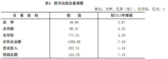 2016年,全国共出版图书50.0万种,较2015年增长5.1%;总印数90.4亿册(张),增长4.3%;总印张777.2亿印张,增长4.6%;定价总金额1581.0亿元,增长7.1%。图书出版实现营业收入832.3亿元,增长1.2%;利润总额134.3亿元,增长7.2%。