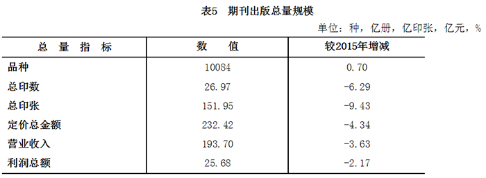 2016年全国共出版期刊10084种,较2015年增长0.7%;总印数27.0亿册,降低6.3%;总印张152.0亿印张,降低9.4%;定价总金额232.4亿元,降低4.3%。期刊出版实现营业收入193.7亿元,降低3.6%;利润总额25.7亿元,降低2.2%。