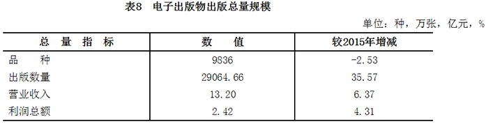 2016年,全国共出版电子出版物9836种,较2015年降低2.5%;出版数量29064.7万张,增长35.6%。电子出版物出版实现营业收入 13.2亿元,增长6.4%;利润总额2.4亿元,增长4.3%。