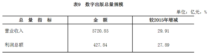 2016年,数字出版实现营业收入5720.9亿元,较2015年增长29.9%;利润总额427.8亿元,增长27.9%。