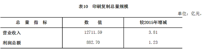 2016年,全国黑白印刷产量 31517.6万令,彩色印刷产量150688.4万对开色令;装订产量33668.5万令。印刷复制(包括出版物印刷、包装装潢印刷、其他印刷品印刷、专项印刷、打字复印、复制和印刷物资供销)实现营业收入12711.6亿元,增长3.8%;利润总额882.7亿元,增长1.2%。