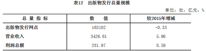 2016年,全国共有出版物发行网点163102处,较2015年降低0.3%;出版物发行实现营业收入3426.6亿元,增长6.0%;利润总额282.0亿元,增长8.6%。