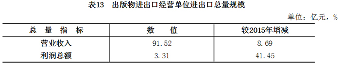 2016年,全国累计出口图书、报纸、期刊、音像制品、电子出版物、数字出版物数量2181.7万册(份、盒、张),较2015年增长2.7%;金额11010.8万美元,增长5.0%[其中,数字出版物出口3055.3万美元,增长29.1%;全国出版物进出口经营单位累计出口数量1766.9万册(份、盒、张),增长13.7%;金额6043.1万美元,增长3.1%]。全国累计进口图书、报纸、期刊、音像制品、电子出版物、数字出版物数量3119.0万册(份、盒、张),增长10.5%;金额55911.1万美元,增长2.1%。进出口总额66921.9万美元(其中,全国出版物进出口经营单位进出口总额61954.2万美元,增长2.2%)。全国出版物进出口经营单位实现营业收入91.5亿元,增长8.7%;利润总额3.3亿元,增长41.5%。