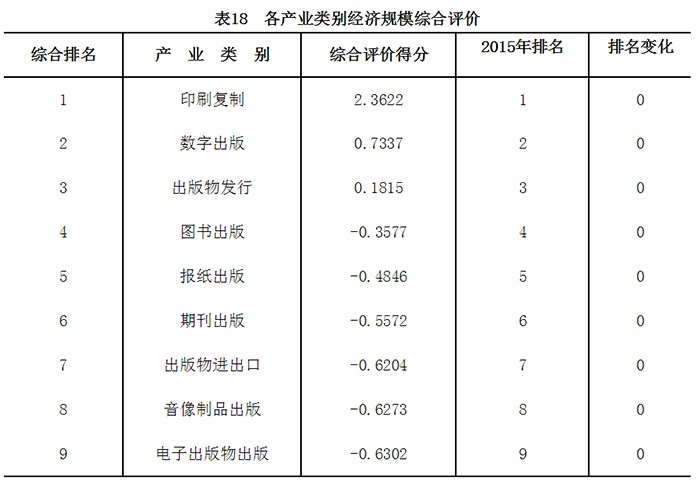 选取营业收入、增加值、总产出和利润总额4项经济规模指标,采用主成分分析法对图书出版、期刊出版、报纸出版、音像制品出版、电子出版物出版、数字出版、印刷复制、出版物发行和出版物进出口共9个新闻出版产业类别的总体经济规模进行综合评价。印刷复制、数字出版和出版物发行分居前三位,保持稳定。
