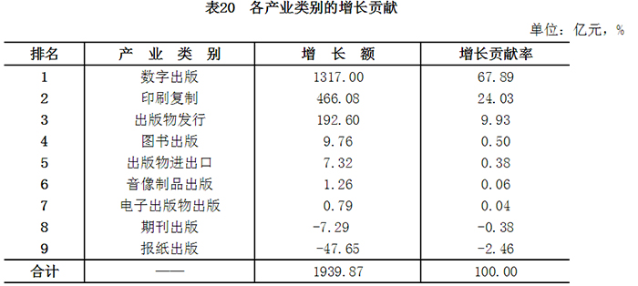 以各产业类别营业收入增长额和增长贡献率衡量其对全国新闻出版产业增长贡献,前3位降序依次为数字出版、印刷复制和出版物发行;数字出版占全行业营业收入增长额的67.9%,提高7.7个百分点;印刷复制占全行业营业收入增长额的24.0%,降低5.9个百分点;出版物发行占全行业营业收入增长额的9.9%,降低2.5个百分点。