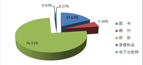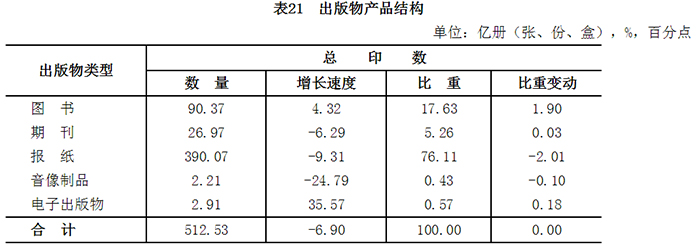 2016年全国共出版图书、期刊、报纸、音像制品和电子出版物512.5亿册(份、盒、张),较2015年降低6.9%。其中,出版图书90.4亿册(张),增长4.3%,占全部数量的17.6%;期刊27.0亿册,降低6.3%,占5.3%;报纸390.1亿份,降低9.3%,占76.1%;音像制品2.2亿盒(张),降低24.8%,占0.4%;电子出版物2.9亿张,增长35.6%,占0.6%。