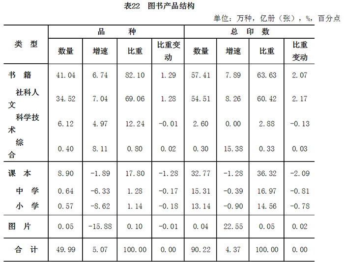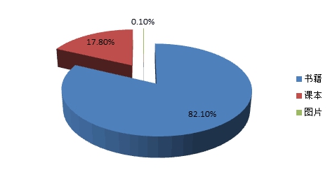 全国出版书籍57.4亿册,增长7.9%,占图书总印数的63.6%;课本32.8亿册,降低1.3%,占36.3%;图片0.04亿册,增长22.6%。