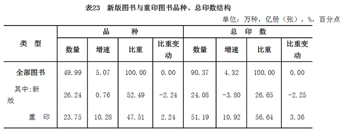 全国出版新版图书24.1亿册,降低3.8%;占图书总印数的26.7%,减少2.3个百分点;重印图书51.2亿册,增长10.9%;占56.6%,提高3.4个百分点。重印图书与新版图书总印数之比由2015年的1.8:1变为2.1:1。
