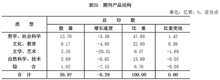 2016年,全国出版哲学、社会科学类期刊12.7亿册,较2015年降低3.4%,占期刊总印数的47.1%,提高1.4个百分点;文化、教育类期刊6.2亿册,降低4.7%,占22.9%,提高0.4个百分点;文学、艺术类期刊2.6亿册,降低20.3%,占9.6%,减少1.7个百分点;自然科学、技术类期刊3.7亿册,降低6.7%,占13.7%;综合类期刊1.8亿册,降低7.4%,占6.8%。哲学、社会科学类期刊占期刊总印数比重继续提高,文化、教育类期刊所占比重有所回升,文学、艺术类期刊占比继续减少。