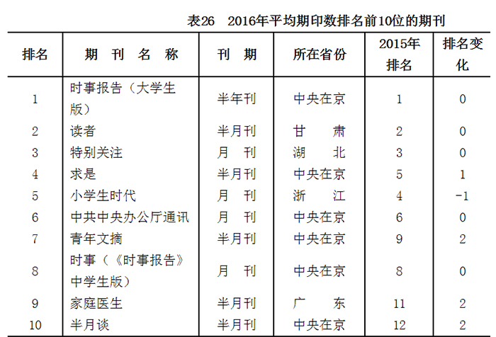 2016年,共有《求是》《时事报告》大学生版和中学生版、《读者》等10种期刊平均期印数超过100万册。其中,《时事报告》平均期印数超过400万册,《读者》《特别关注》《小学生时代》《青年文摘》和《家庭医生》等文摘类、少儿类、科普类期刊占据半数。