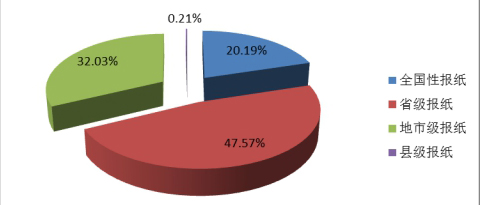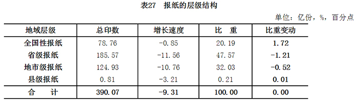 报纸根据地域层级划分为全国性报纸、省级报纸、地市级报纸和县级报纸4类。 2016年,共出版全国性报纸78.8亿份,较2015年降低0.9%,占报纸总印数的20.2%,提高1.7个百分点;省级报纸185.6亿份,降低11.6%,占47.6%,减少1.2个百分点;地市级报纸124.9亿份,降低10.8%,占32.0%;县级报纸0.8亿份,降低3.2%,占0.2%。全国性报纸所占比重继续提高,省级报纸仍占据半壁江山,但比重继续减少;省级和地市级报纸印数下滑加剧,占报纸总印数比重出现下降。