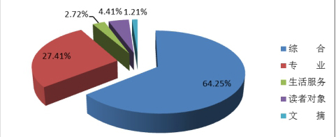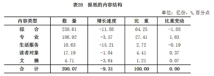 报纸根据内容划分为综合、专业、生活服务、读者对象和文摘5大类。 2016年,全国出版综合类报纸250.6亿份,较2015年降低11.9%,占报纸总印数的64.3%,减少1.9个百分点;专业类报纸106.9亿份,降低3.6%,占27.4%,提高1.6个百分点;生活服务类报纸10.6亿份,降低15.2%,占2.7%;读者对象类报纸17.2亿份,降低1.0%,占4.4%,提高0.4个百分点;文摘类报纸4.7亿份,降低3.6%,占1.2%。综合类与生活服务类报纸降幅较大,所占比重有所减少;市场细分更为清晰、读者对象更为明确的专业类与读者对象类报纸降幅较小,所占比重有所提高。