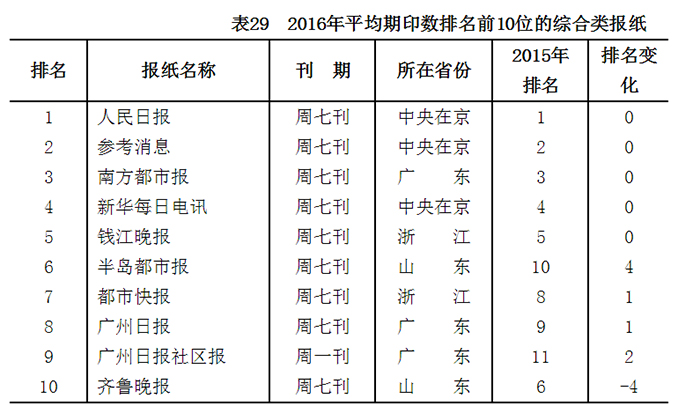 2016年,共有《人民日报》《参考消息》《环球时报》等25种报纸平均期印数超过100万份,较2015年减少1种;其中综合类12种,减少1种;专业类报纸11种;读者对象类报纸2种。2016年平均期印数排名前10位的综合类报纸,详见表29。