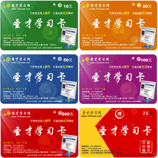 目前发行的圣才学习卡共分10、20、50、100、200元五种面值,另有面值为20元的赠卡。