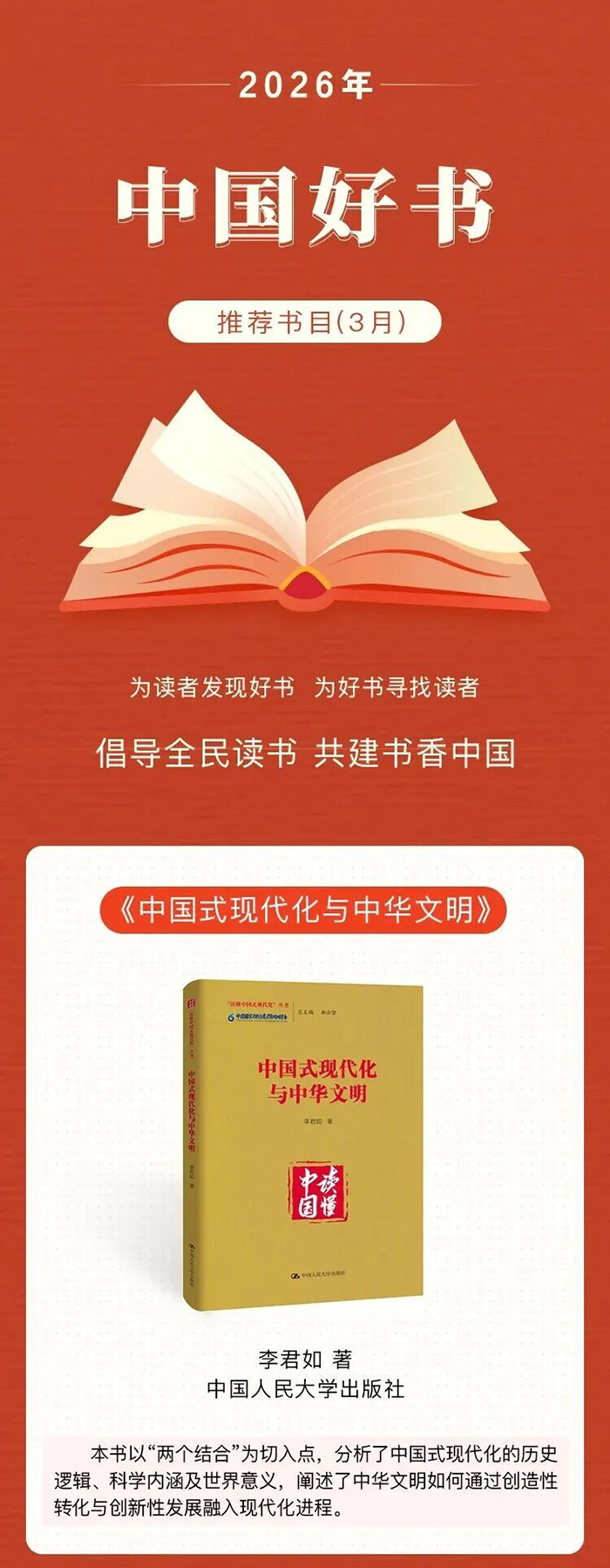 日前,中国图书评论学会发布2026年3月“中国好书”,中国人民大学出版社出版的《中国式现代化与中华文明》入选。
