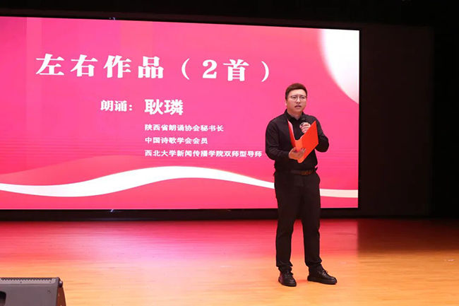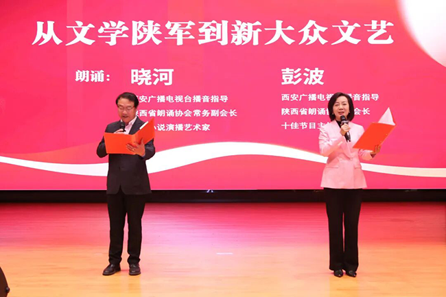 朗诵环节,陕西省朗诵协会的艺术家们用声音赋予文字以温度。朗诵协会副会长彭波深情演绎了外卖员诗人王计兵的作品,“赶时间的人没有四季,只有一站和下一站”,让人感受到奔走于街巷间的坚韧与诗意;朗诵协会秘书长耿璘朗诵的左右诗作《裂缝》,引发了关于个体与世界的深邃叩问。随后,彭波与朗诵协会常务副会长晓河联袂朗诵会议主题原创作品《从文学陕军到新大众文艺》,艺术化地勾勒了三秦文脉薪火相传、生生不息的动人画卷。