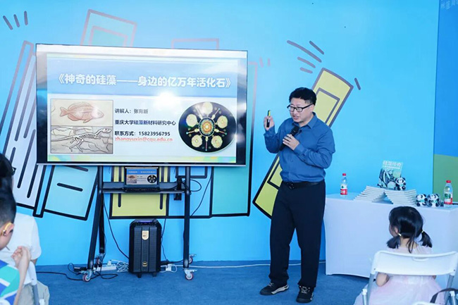 重庆大学教授张育新携科普新作《硅藻传奇:人类文明的绿色未来》亮相,以“向自然学习,为未来赋能——探秘硅藻基仿生新材料与绿色未来”为题,将显微镜下的微观世界带到读者眼前。张育新教授以其深厚的学术功底与生动的讲述方式,带领现场读者走进了一个微小却充满智慧的微观世界。他从硅藻的起源与演化讲起,揭示了这种单细胞生物如何以其精妙的硅质外壳成为“自然界的建筑师”,并深入浅出地阐释了硅藻土在过滤、建材、环保、农业等领域的广泛应用,展现了其作为“环境卫士”的现实价值,吸引了众多青少年读者和家长驻足聆听。