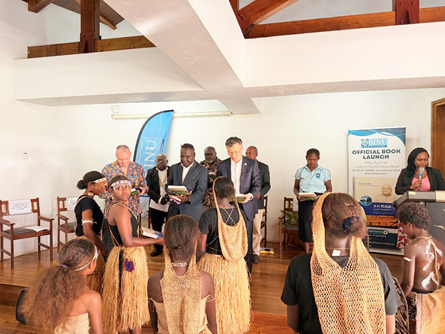 近日,中国海洋大学出版社出版的《乡村男孩爵士——为所罗门群岛服务的一生》新书发布会在所罗门群岛国立大学举办。率团出访所罗门群岛、澳大利亚相关高校及机构的中国海洋大学校长张峻峰应邀出席,与本书作者、所罗门群岛国立大学名誉校长奈森·凯雷爵士(Sir Nathan Kere)等所方有关人士共同见证这一承载中所学术情谊的文化成果面世。