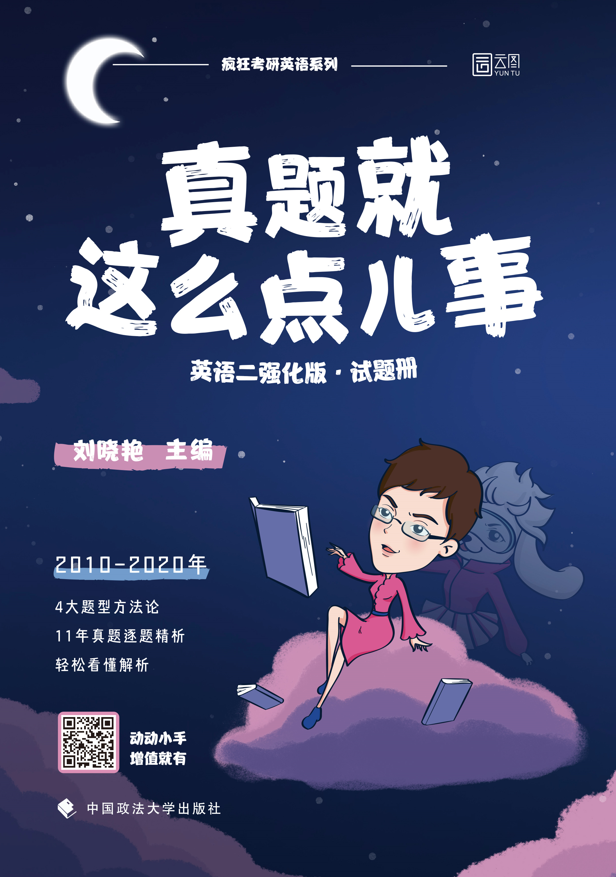 本书精选英语二从2010到2020年的十一年真题。从考生使用角度考虑,本书采用试题册和解析册单独装订,更易于考生翻阅,便于复习与备考。历年真题的答案解析全面详尽,编者尽力用通俗易懂的语言让学生知其然,并知其所以然,突破市面上传统的专业枯燥的词汇,更多的是用考生的语言进行讲解。同时为了便于满足考生对真题完整的理解,本书的答案解析中为完形、阅读理解、新题型和翻译共计七篇文章都配有全文翻译,助力力考生全面把握并利用真题。