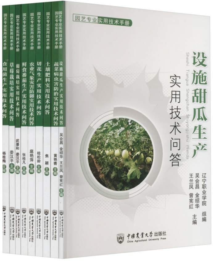《设施甜瓜生产实用技术问答》 《蔬菜病虫害防治实用技术问答》 《草莓栽培实用技术问答》 《农业气象灾害防御实用技术问答》 《葡萄栽培实用技术问答》 《食用菌生产实用技术问答》 《切花生产实用技术问答》 《鲜食番茄生产实用技术问答》 《土壤肥料实用技术问答》