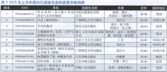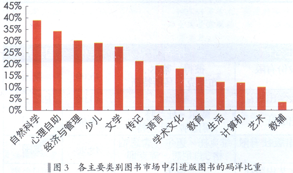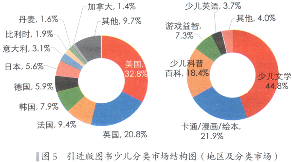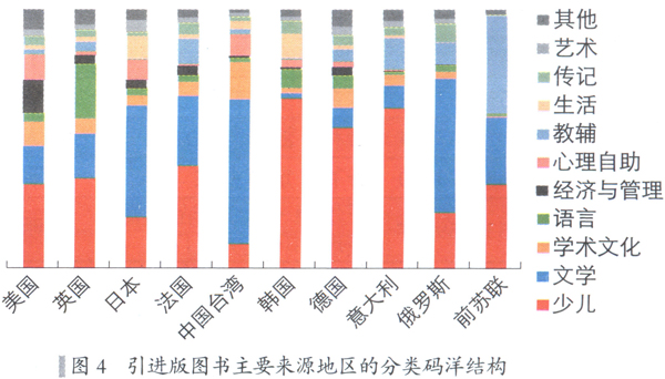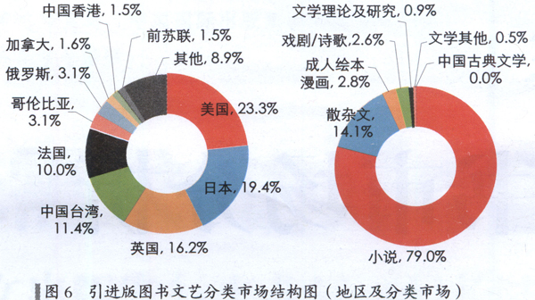 除了少儿和文学以外,经竹类图书在来自美图的引进版图书中、语言类在来自英国的引进版图书中、学术文化在来自中国台湾的引进版图书中、生活类图书在来自日本和韩国的引进版图书中、心理自助类在来自美国、日本和中国台湾地区的引进版图书中也有相对较大的比重。这反映出我国引进版图书市场的一大结构特点。
