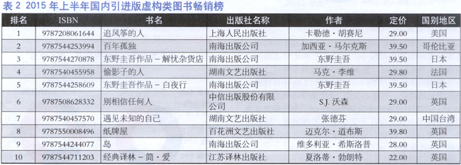 在畅销书方面,本期位于销量排名前三的作品依次为:美国作家卡勒德·胡赛尼著的《追风筝的人》、哥伦比亚作家加西亚·马尔克斯著的《百年孤独》及日本作家东野圭吾著的《解忧杂货店》。其中《解忧杂货店》于2014年4月在中国面市,随即取得非常好的市场反响,在本期虚构类畅销书榜单中居第三位,而作为作品本身,《解忧杂货店》在东野圭吾众多的作品中有着特殊的位置,虽非其典型性作品,却更明晰地凸显出其作品的特质——追求细腻的情感体验,有着日本文学纤细、哀怨的特点。这也是继《白夜行》后,东野圭吾最受欢迎的作品。