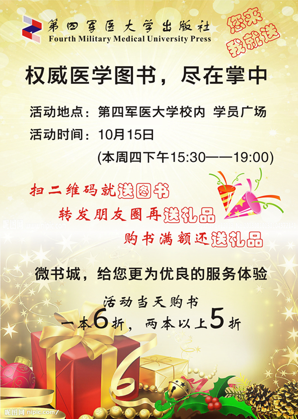 2015年全国执业药师资格考试即将拉开帷幕,值此之际,四医大出版社微书城送书活动也隆重上线。以扫二维码即送图书,转发朋友圈、购书满额赠送礼品为形式开展线上线下配合的微信营销活动。权威医学图书,尽在掌中。