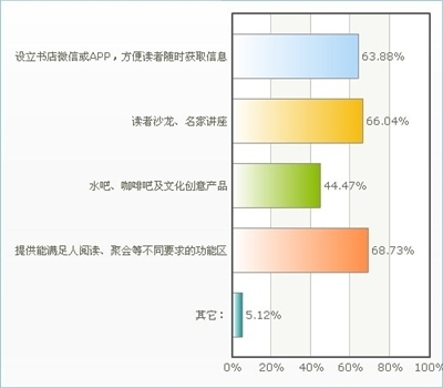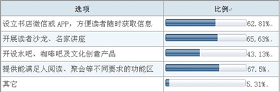 对于书店提供特色服务的建议,读者的要求愈发细化。67.5%的读者希望书店提供能满足阅读、聚会等不同要求的功能区,65.63%的读者要求书店开展读者沙龙、名家讲座,62.81%的读者希望设立书店微信或APP,方便随时获取信息。(见附表)