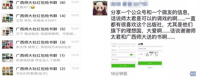 2015年社群营销成为图书宣传的关注重点,作为出版社的新媒体营销人员,我也有目的地在新媒体社群营销上进行更多的尝试。在我看来,做好图书的社群营销重点关注两个方面。一方面是如何借助国内已有平台,与国内各大读书社群及读书会组织进行合作,以作为广西师大出版社图书产品营销及曝光的一个渠道;另一方面,利用微博、微信等平台积累起来的用户资源,搭建我社自有的读者社群平台,既是服务读者的一个平台,也可作为出版企业形象宣传和品牌传播和一大阵地。