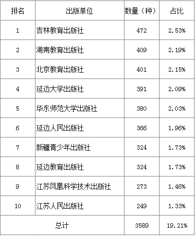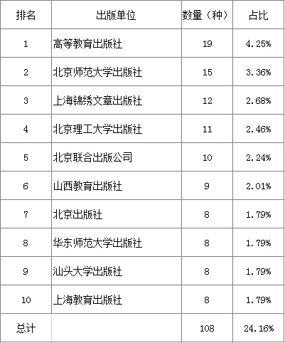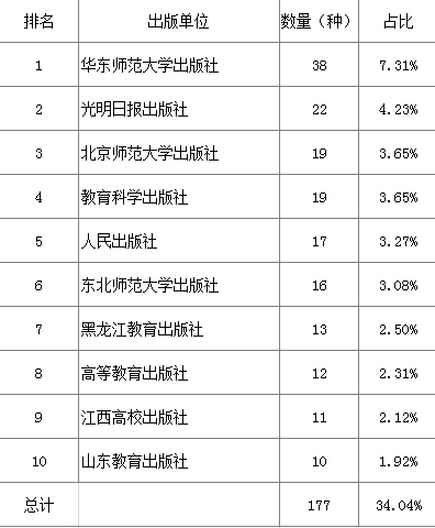 统计数据显示,共有507家出版单位出版文化教育图书,占全国出版单位八成多,占比85.64%。在排名前十出版单位中,共有4家专业教育社,其中3家位居前三,排名前十出版单位共占比19.21%(见表2)。