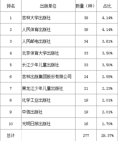 表6 2016年1季度体育排名前十出版单位