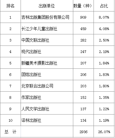 统计数据显示,共有456家出版单位出版文学图书,占全国出版单位七成多,占比77.03%。在排名前十出版单位中,既有文学社,也有少儿社和其他类型社。排名第一的吉林出版集团股份有限公司占比远高于其他出版单位,文学社在出版数量上并不占有优势,排名前十出版单位共占比26.07%(见表11)。