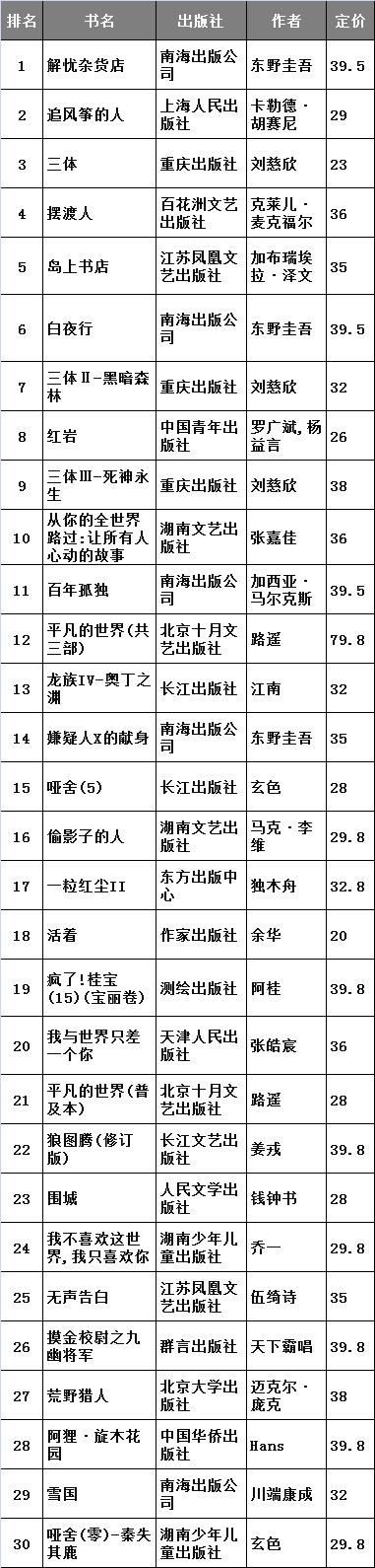 4月虚构类畅销书榜与3月相比,前十名的品种基本没有变化。位列前三的分别是《解忧杂货店》《追风筝的人》《三体》。前十名的图书里,外国文学作品和中国文学作品分别占五席,其中,科幻作家刘慈欣独占三席,作品分别为《三体》《三体Ⅱ-黑暗森林》《三体Ⅲ-死神永生》。日本作家东野圭吾占两席,作品为《解忧杂货店》《白夜行》。
