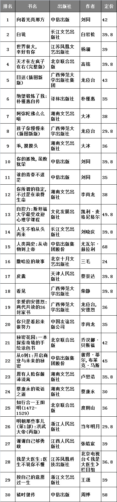 4月非虚构类畅销书榜走势更为平稳,但是有一瞥惊鸿不得不提,中信出版推出的刘同新书《向着光亮那方》4月上市即登上4月非虚构类畅销书排行榜榜首,在此轮“刘同热”的带动下,其另外两本书《你的孤独,虽败犹荣》《谁的青春不迷茫》名次也上升到第十、十一位,特别是刘同的处女秀《谁的青春不迷茫》为4月再次上榜作品。