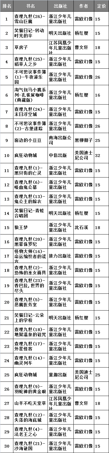 4月少儿类畅销书榜中,雷欧幻像的“查理九世”系列占十七席,《不可思议事件簿》占两席,《怪物大师》占一席,雷欧幻像、浙少社都属少儿类畅销书榜的“榜霸级”作者及出版社。除此以外,曹文轩作品、杨红樱作品、沈石溪作品均榜上有名。再就是之前受电影走红而热销的同名图书《疯狂动物城》也在竞争激烈的少儿类畅销书榜中占一席之地。