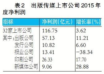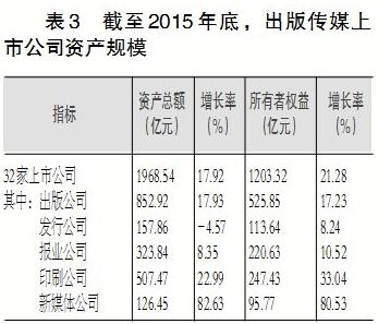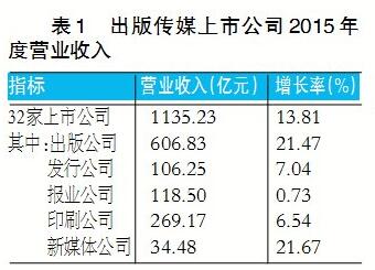 截至2015年底,在内地主板和创业板上市的出版传媒公司共计32家,资产总额1968.54亿元,所有者权益1203.32亿元,全年实现营业收入1135.23亿元,净利润116.75亿元。出版传媒上市公司经营规模不断扩大,产出和利润持续增长,总体保持稳健发展态势。