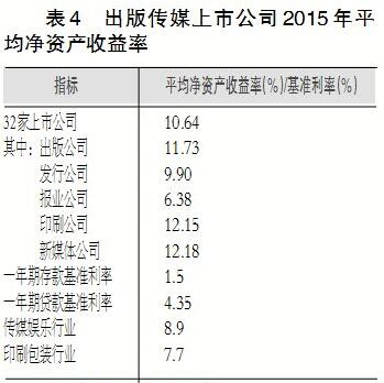 2015年,出版传媒上市公司平均净资产收益率为10.64%,高于传媒娱乐行业8.9%和印刷包装行业7.7%的平均水平;也高于当前一年期存款基准利率(1.50%)和贷款基准利率(4.35%),显示出版传媒上市公司整体具有较强的盈利能力。