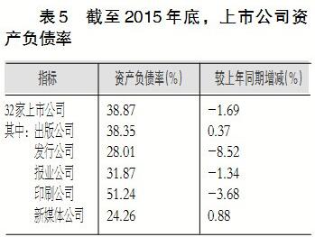 截至2015年底,32家出版传媒上市公司资产负债率为38.87%,较上年同期下降了1.69个百分点,保持了较好的长期偿债能力。
