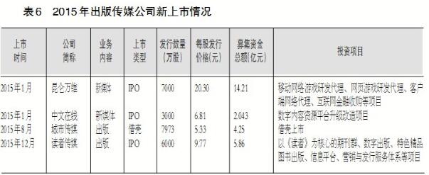 2015年全年,共有昆仑万维、中文在线、读者传媒等3家公司实现IPO上市,城市传媒借壳上市,募集资金总额26.36亿元。