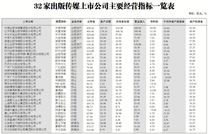 根据上市公司2015年年度报告,对内地主板和创业板上市的32家出版传媒企业(出版公司9家、发行公司4家、报业公司6家、印刷公司10家、新媒体公司3家)经营情况分析如下。