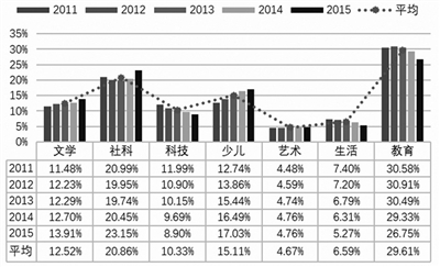 “十二五”期间整体市场码洋份额如图1-3所示。码洋份额最高的是教育类,在26.5%~31%之间,平均码洋份额接近30%。其次是社科类,码洋份额在19.5%~23.2%之间,平均码洋份额接近21%。少儿类排在第3位,码洋份额在12.5%~17.1%之间,平均码洋份额超过15%。文学类排在第4位,码洋份额在11.4%~14%之间,平均码洋份额超过12.5%。艺术类垫底,在4.4%~5%之间,平均码洋份额不到4.7%。在这5年中,文学类、少儿类和艺术类的码洋份额同比都保持了稳定增长,增幅分别在0.06~1.3、0.5~1.6和0~0.2个百分点之间;科技类和生活类同比都出现了持续下滑,降幅分别在0.4~1.1和0.2~1.1个百分点之间;其他几类均有不同幅度的上下波动。