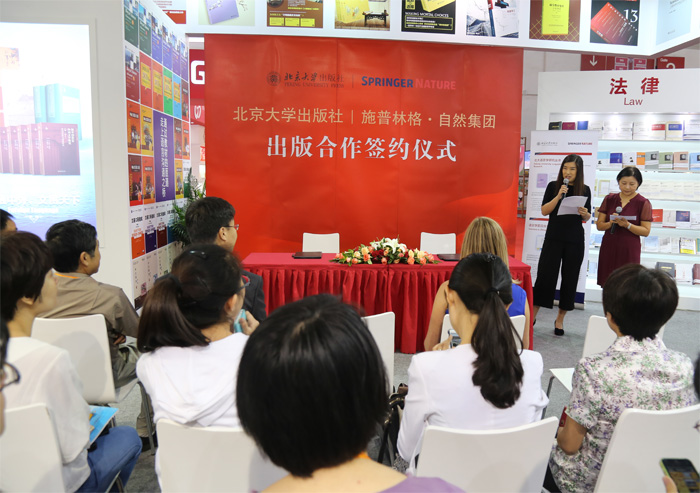2016年8月25日上午,北京大学出版社与施普林格·自然集团“北大语言学研究丛书”及“语言学前沿丛书”合作出版签约仪式在新国展西2馆隆重举行。北京大学出版社社长王明舟先生、总编辑张黎明先生,施普林格·自然集团社会科学与哲学编辑总监Myriam Poort女士,丛书主编、北京大学中国语言学研究中心郭锐教授、香港理工大学北京联络处李东航副主任等嘉宾出席了此次签约仪式。