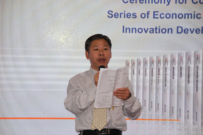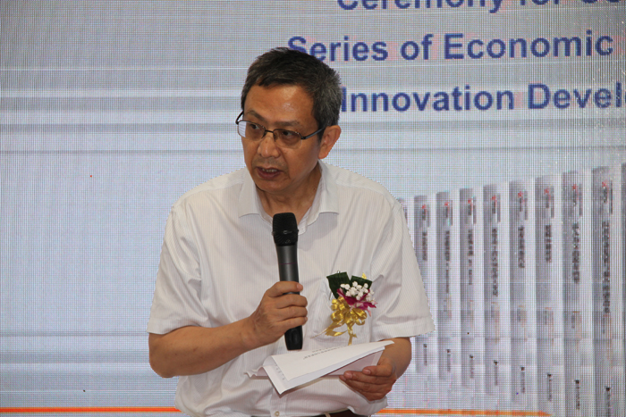 丛书编委、作者代表财政部财政科学研究所贾康所长首先介绍了该套丛书的编写出版基本情况。作为浙江大学出版社联合由迟福林研究员领衔的中国(海南)改革发展研究院共同组织策划出版的“大国大转型”系列丛书的第一辑,《中国经济转型与创新发展丛书》定位面向未来,针对社会关注、“十二五”期间突显出来、同时也是“十三五”期间需要研究和解决的中国经济中长期转型的重大问题(如区域协调发展、财政体制改革、现代服务业、能源战略、社会保障、政府治理方式转变等)进行研究分析,提出政策思路和解决问题之道,探讨未来5~10年中国“大国转型”之路。