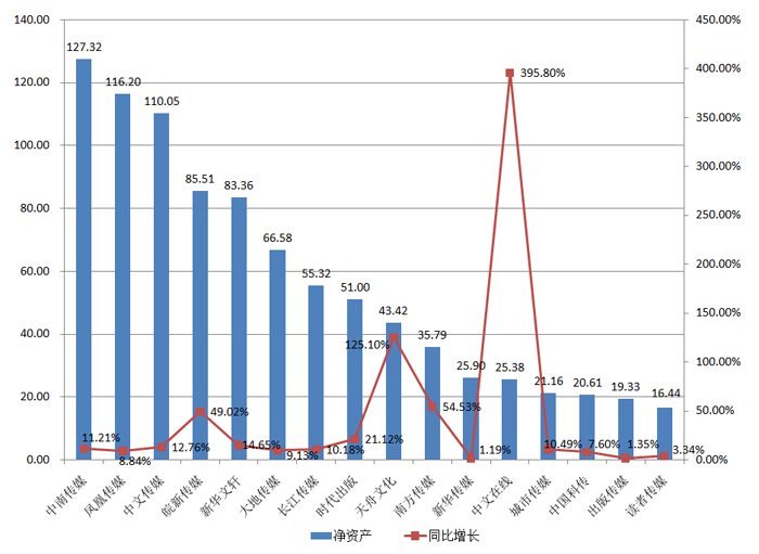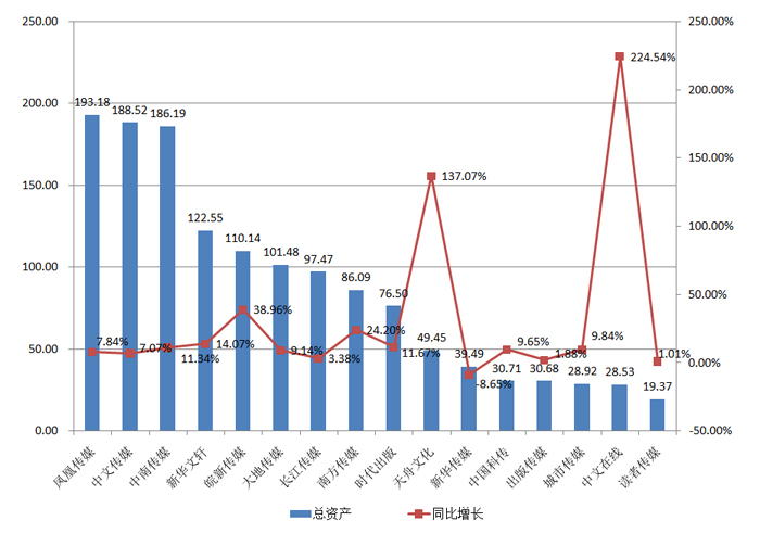 图1 2016年出版业上市公司总资产及变动情况(单位:亿元,%)
