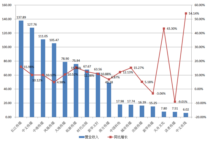 图3 2016年出版业上市公司营业收入及变动情况(单位:亿元,%)