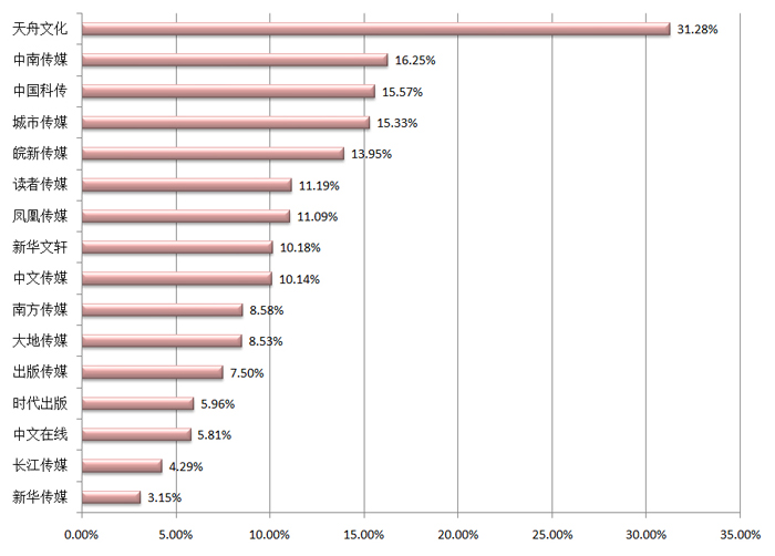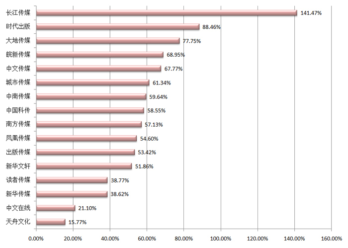 从净利润的变动情况看,有13家公司实现了正增长,3家出现负增长。其中,净利润率同比增长最高的是长江传媒,为82.42%;之后依次为出版传媒,57.52%;天舟文化,38.22%。长江传媒净利润的增长与其业务结构及发展策略有很大关系。
