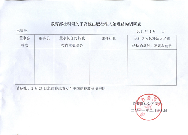 教育部社科司关于高校出版社法人治理结构调研表 - 信息公告 - 中国高校教材图书网