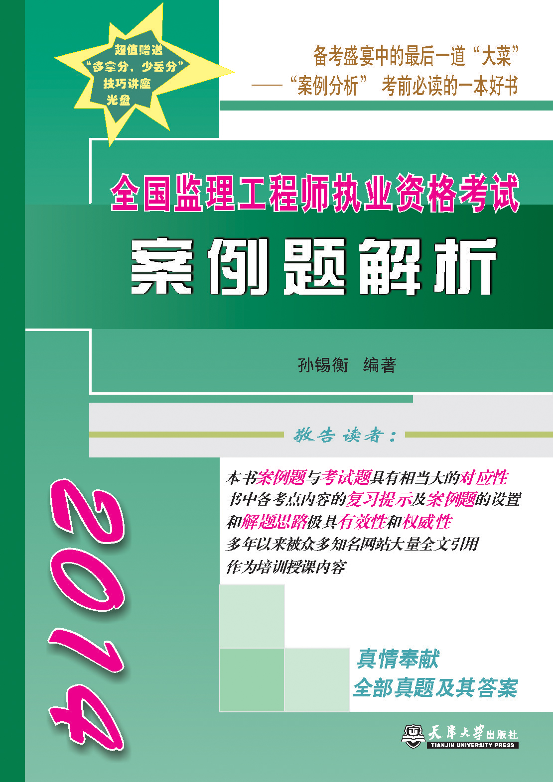 书 名:《全国监理工程师执业资格考试案例题解析(随书赠送:“多拿分,少丢分”考前冲刺辅导权威讲座视频光盘) 》 出版者:天津大学出版社 书 号:ISBN 978-7-5618-1908-1 开 本:16开 定 价:85元 随书赠送:“多拿分,少丢分”考前冲刺辅导权威讲座视频光盘