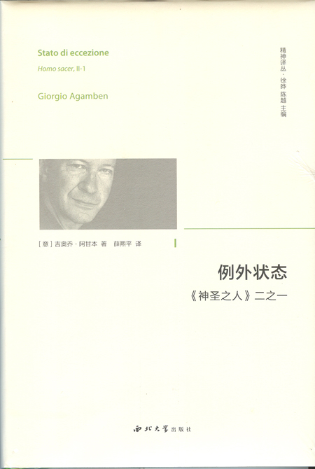 由西北大学出版社出版,徐晔、陈越主编的这套思想学术译丛首批面市6种,分别是海德格尔的《从莱布尼茨出发的逻辑学的形而上学始基》、康吉莱姆的《正常与病态》、巴利巴尔的《斯宾诺莎与政治》、朗西埃的《词语的肉身:书写的政治》、《歧义:政治与哲学》,和阿甘本的《例外状态》。护封上还列有第一辑10种的书目。